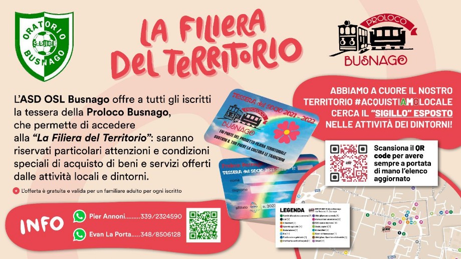 Cari Atleti, Genitori, siamo lieti di comunicarVi che l'ASD Oratorio S. Luigi Busnago ha attivato una collaborazione con la Proloco di Busnago al fine di favorire la realizzazione di percorsi sinergici sul territorio comunale/provinciale promuovendo la conoscenza e la tutela dei beni del territorio attraverso il progetto “La Filiera Del Territorio”.
